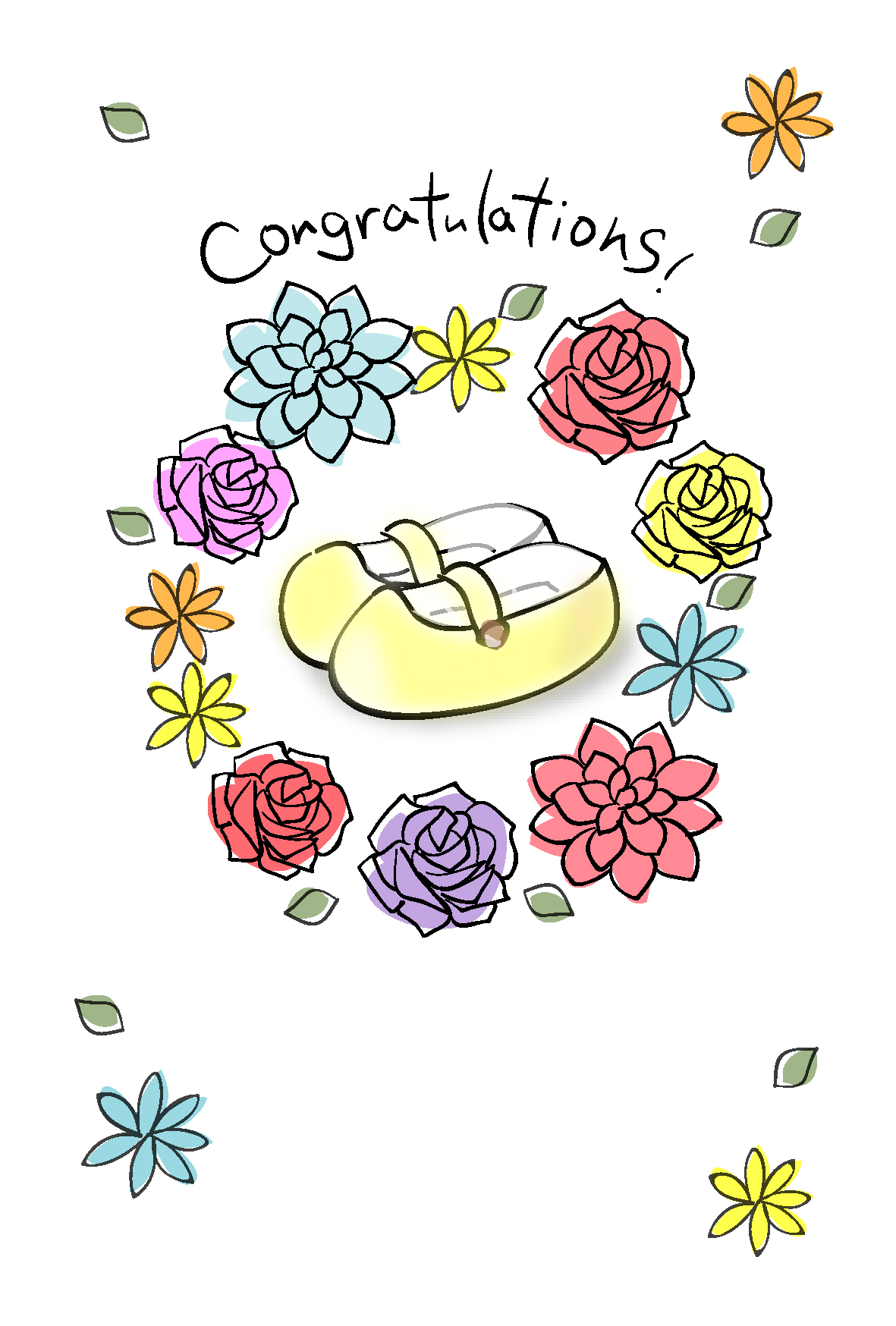 出産祝いはがきテンプレート「ベビーシューズ・イエロー・Congratulations」ダウンロード