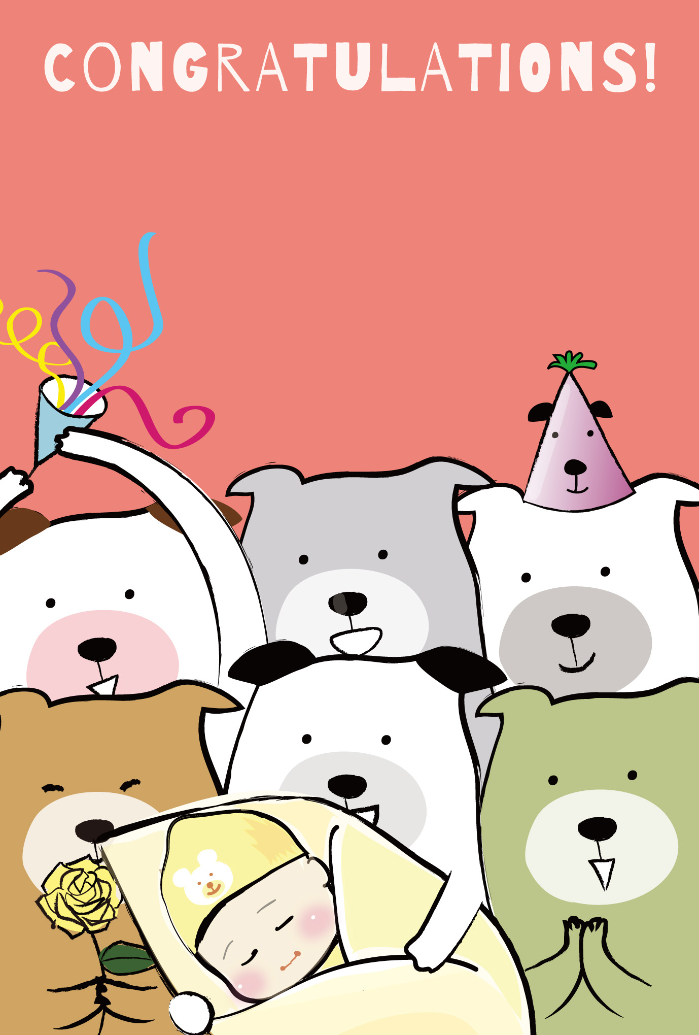 出産祝いはがきテンプレート「赤ちゃんとわんこたち」ダウンロード