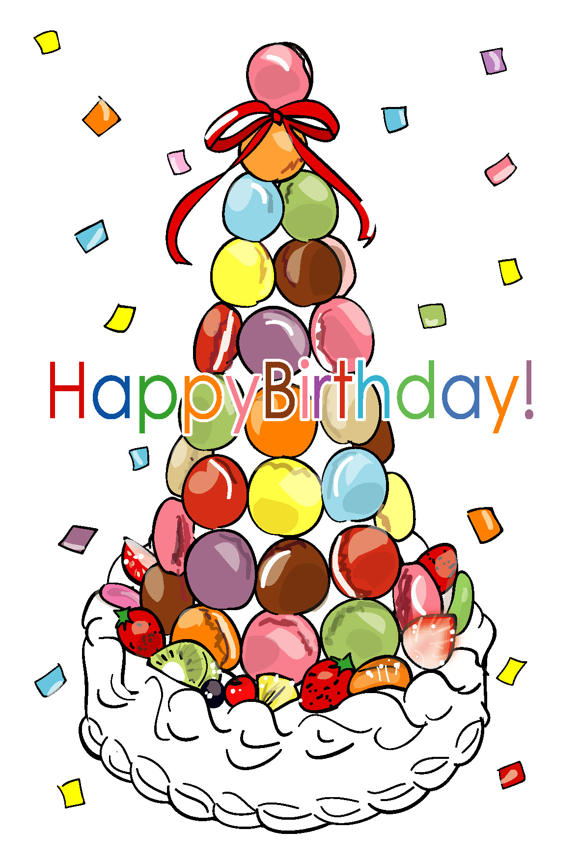 誕生日のお祝いはがきテンプレート「マカロンタワーのケーキ」ダウンロード