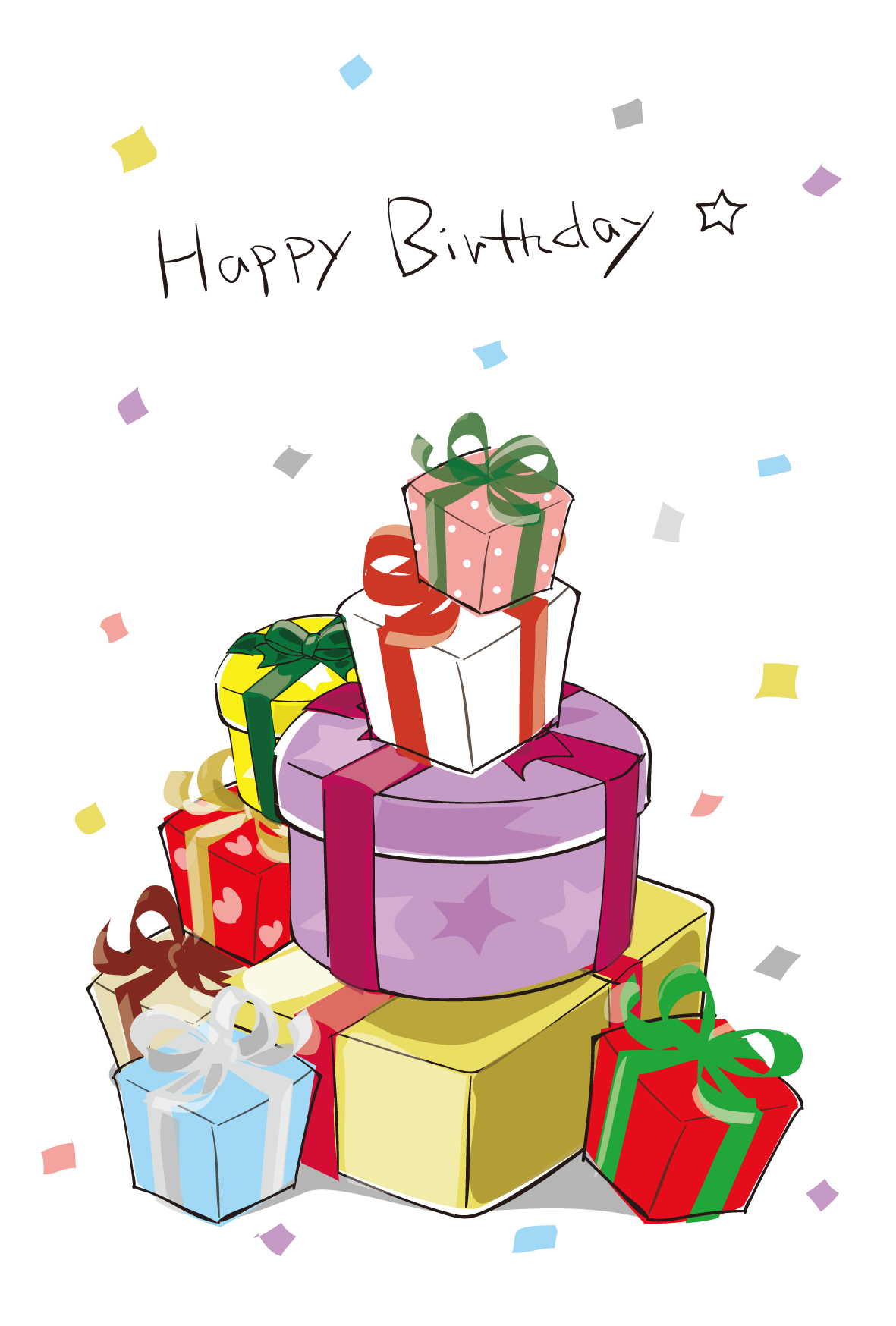 積まれたプレゼントと紙ふぶきが楽しげなバースデーカードテンプレート