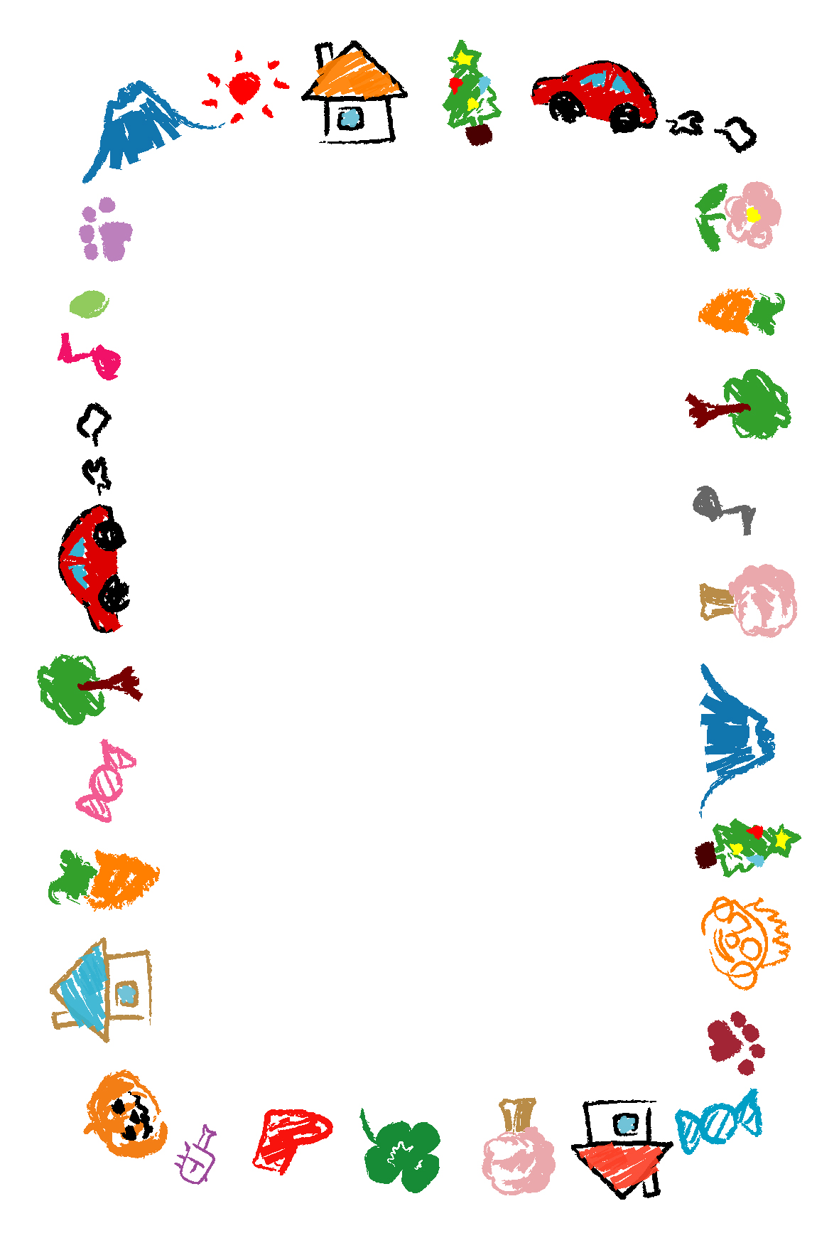 子どものらくがき風かわいい飾り枠のはがきテンプレートです。子どもさんへの手紙やイベントの案内状など
