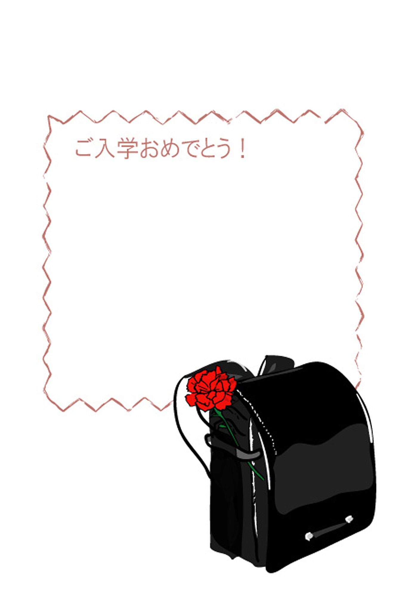 赤いカーネーションがかわいい、黒いランドセルのイラストの入学祝いカードテンプレートです