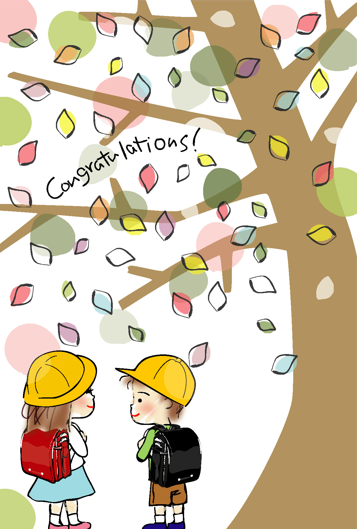 入学・卒業祝いポストカードテンプレート「色とりどりの葉っぱと木と一年生2」ダウンロード