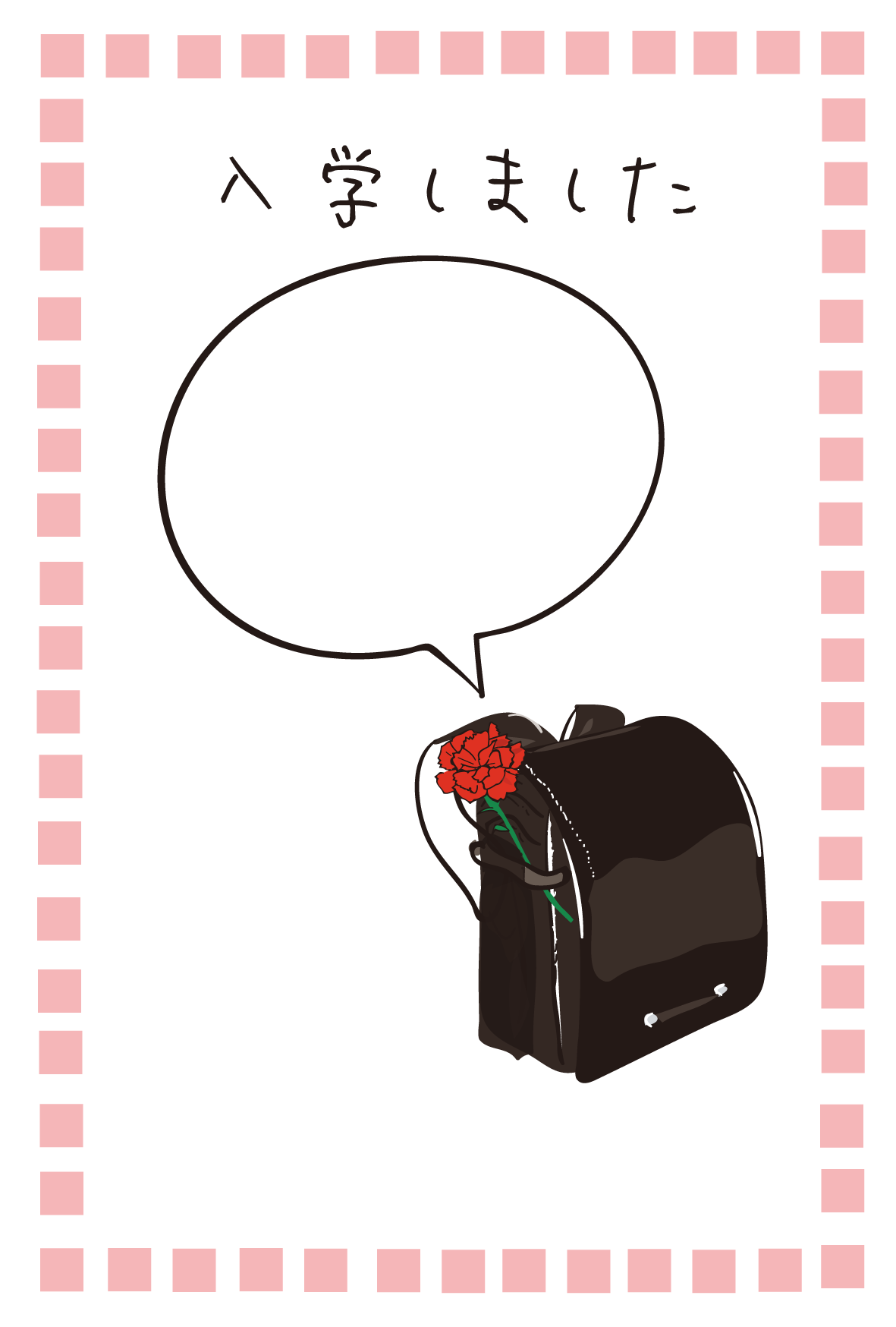 入学報告はがきテンプレート・写真フレーム「黒いランドセルとふきだし」ダウンロード
