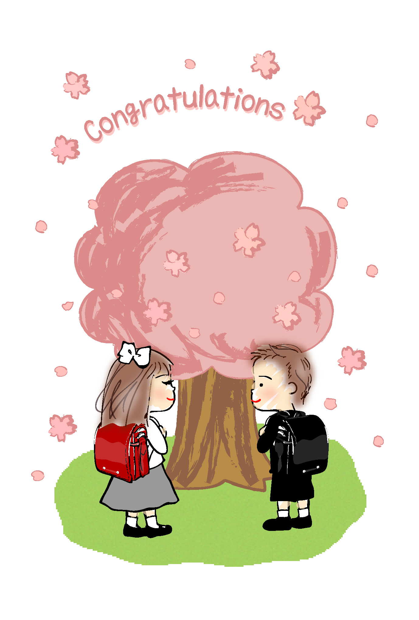 入学・卒業祝いポストカードテンプレート「桜と新一年生」ダウンロード