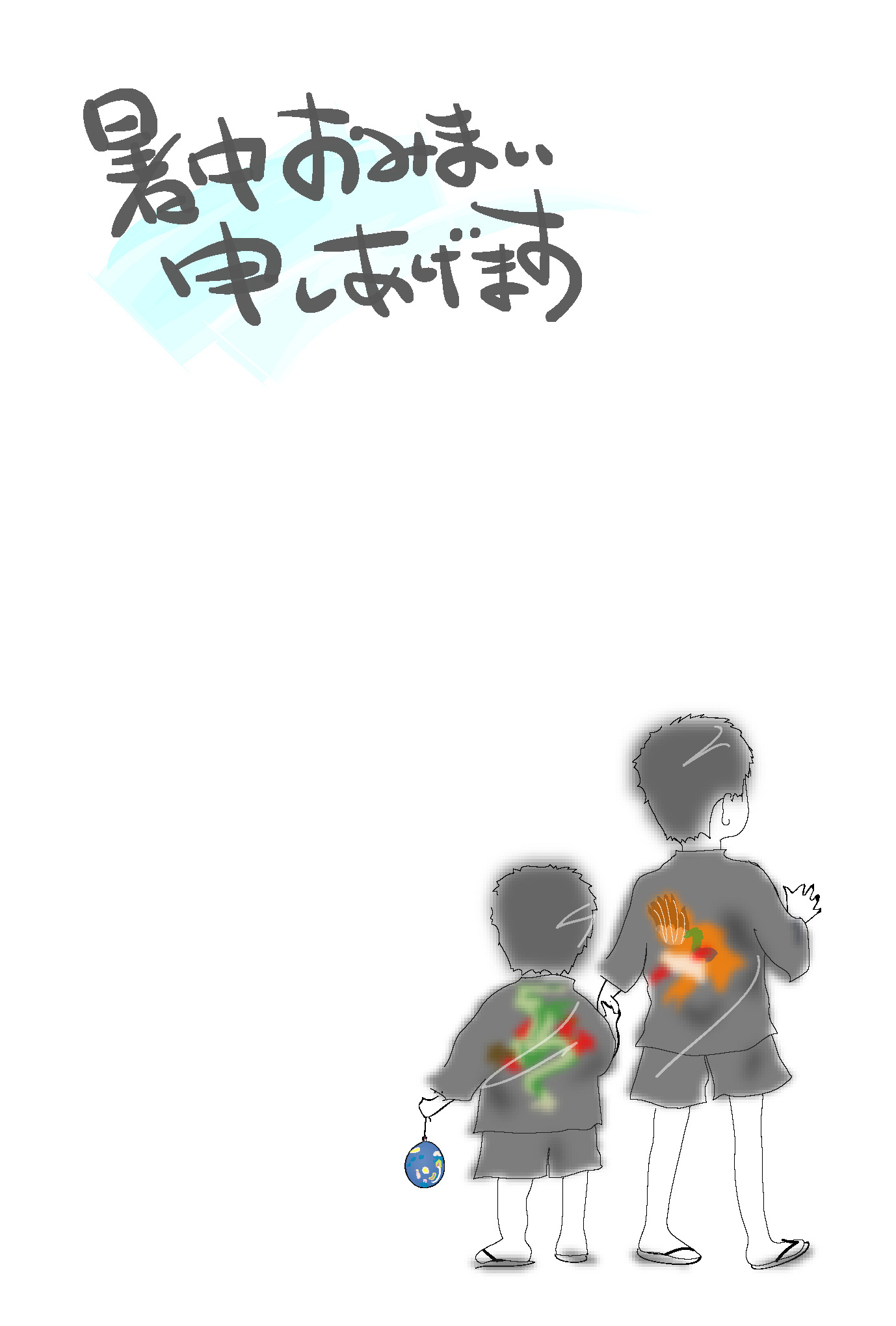 お祭りに行く兄弟、素朴なイラストの暑中見舞いはがきテンプレートです