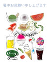 和風なあじさいや美味しそうな食べ物などのイラストの暑中見舞いはがきテンプレート