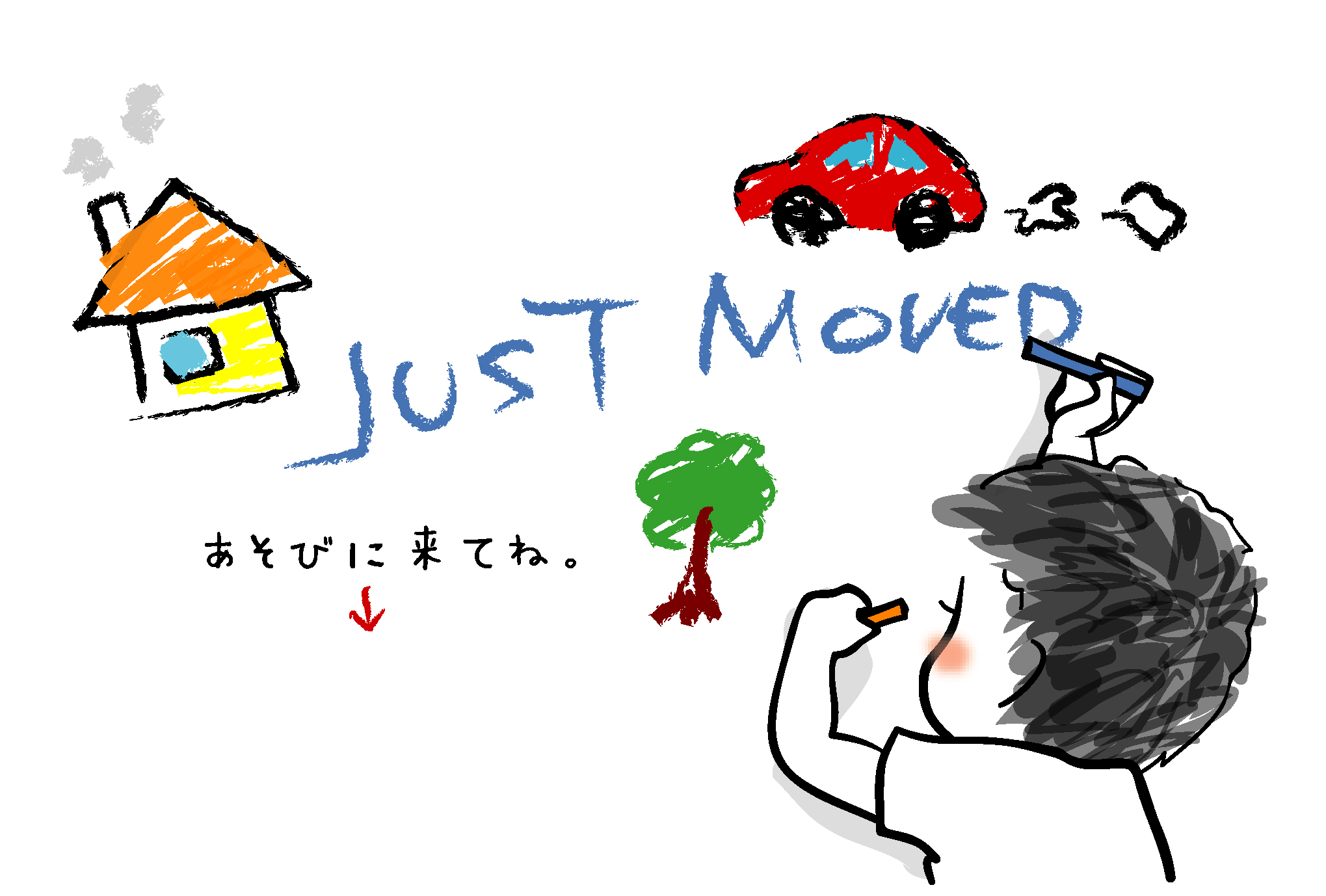 こどもがクレヨンでお絵描きをしているイラスト。かわいい引越し報告はがきです