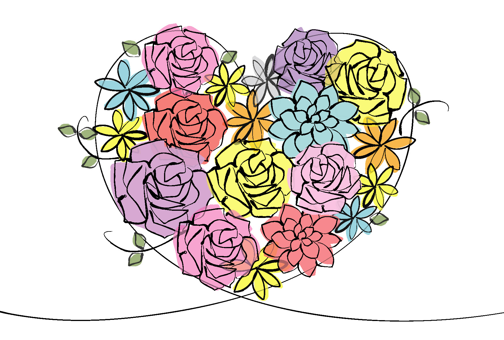 ホワイトデー・ウェディングのポストカードテンプレート「ハートの型に入れたお花」ダウンロード