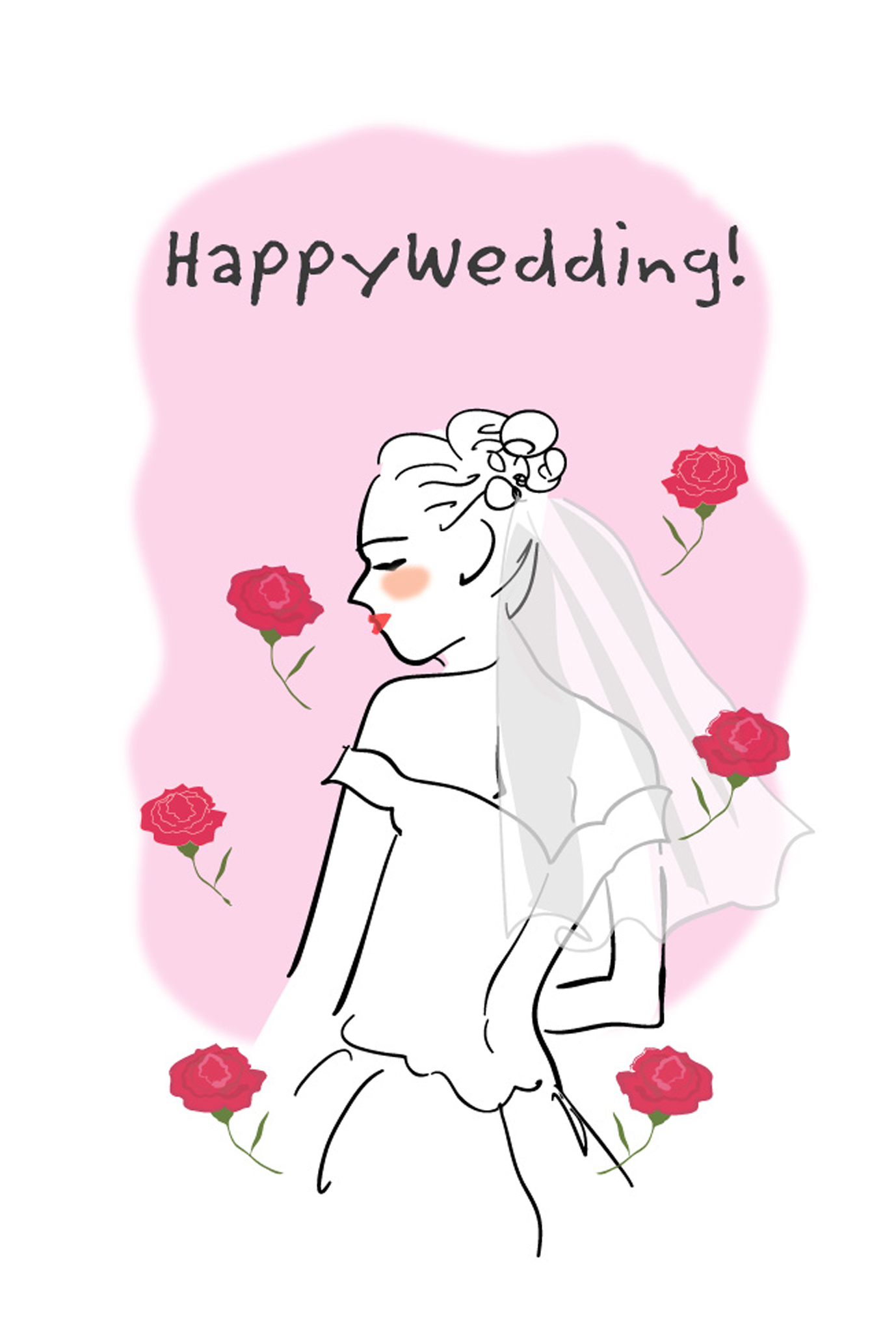 シンプルな花嫁さんと かわいいバラのイラストのウェディングカードテンプレートです