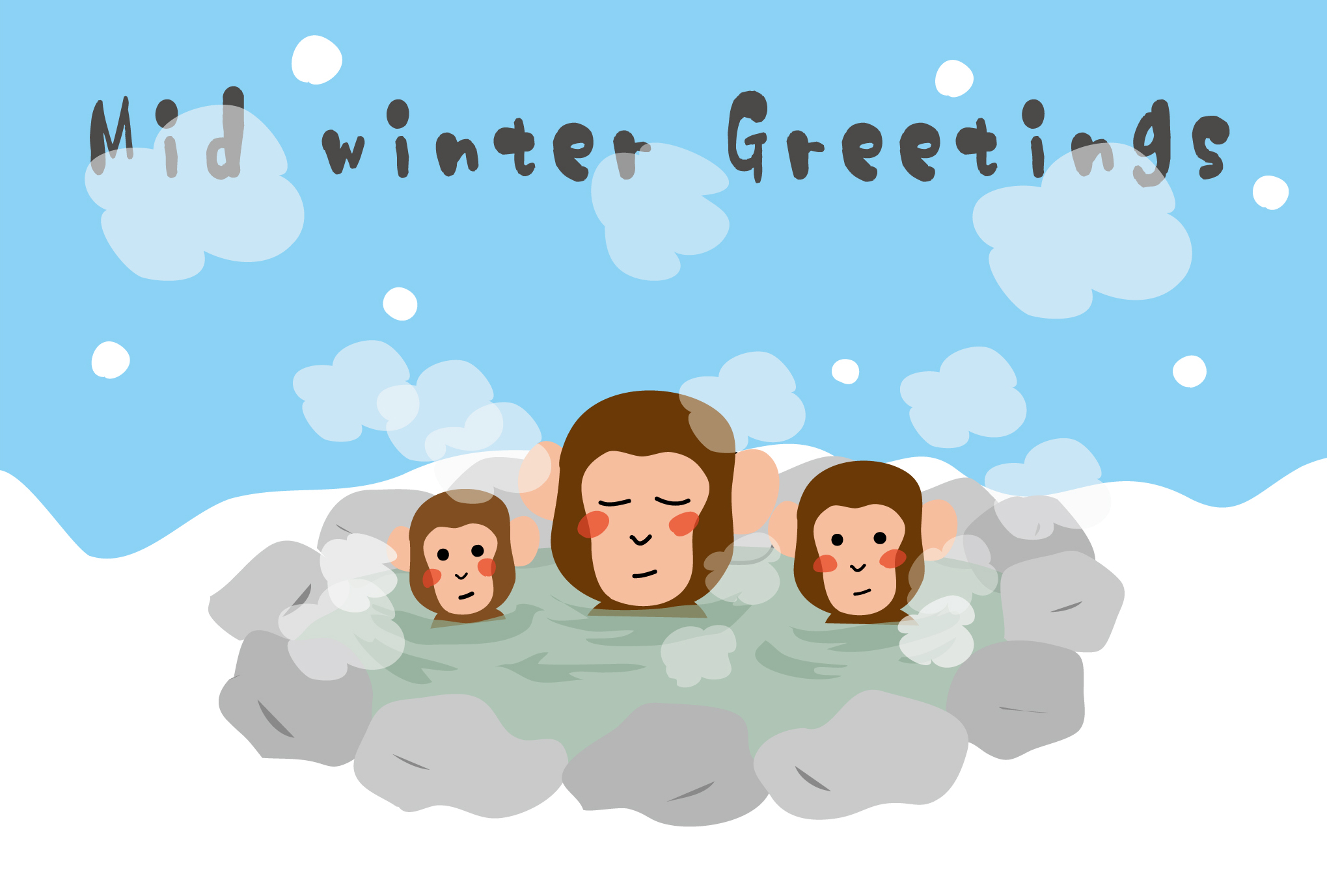 ほっこりかわいい温泉お猿のイラストの寒中見舞いはがきテンプレート。冬のご挨拶に