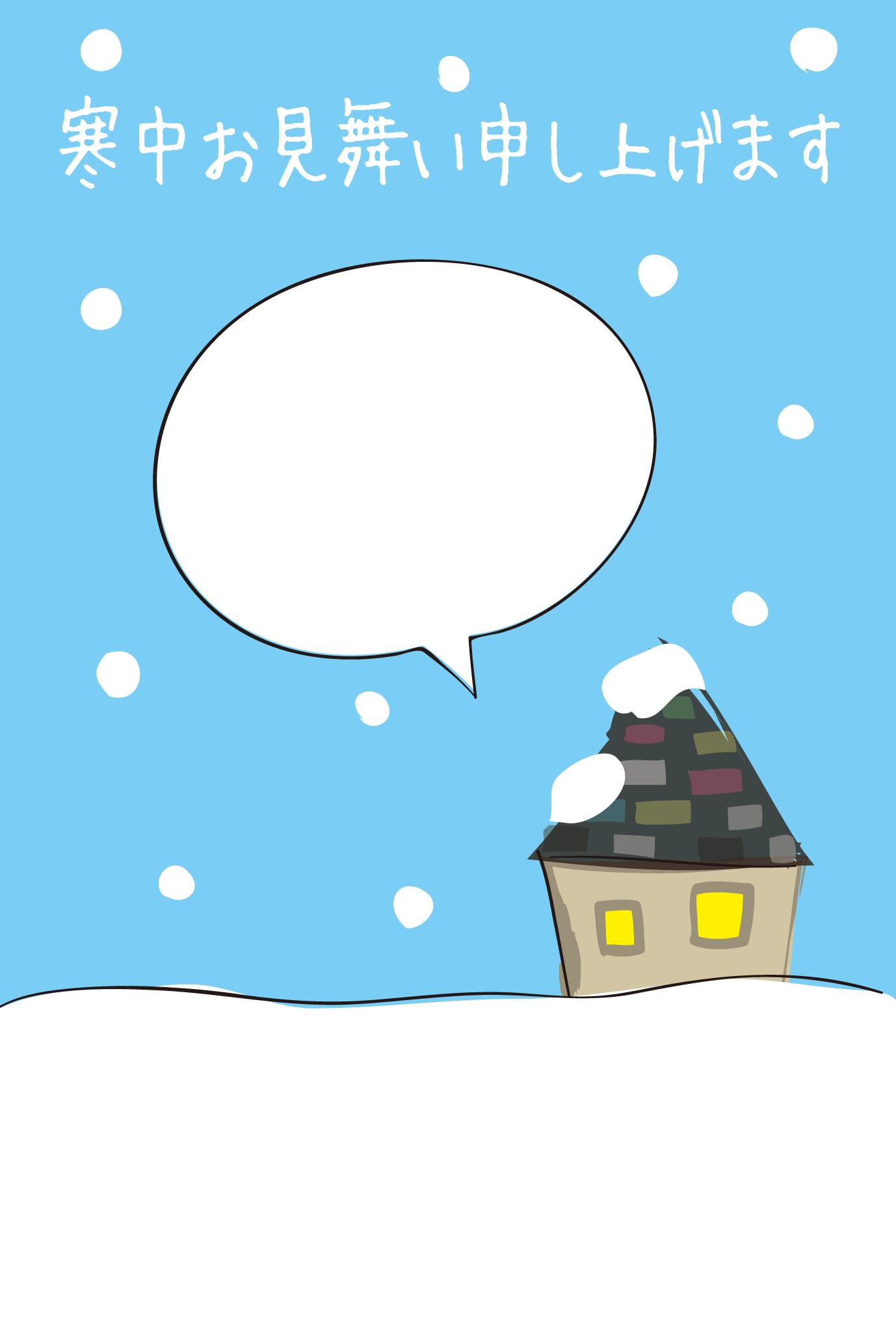 寒中見舞いはがきテンプレート「雪と家と吹き出し」ダウンロード